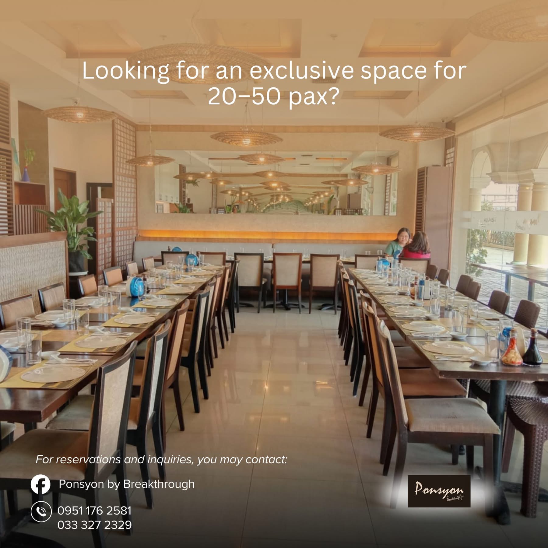 Ponsyon offers an exclusive, refined setting perfect for professional functions and intimate social events. Featuring a modern interior with elegant mirrored accents and warm lighting, this fully air-conditioned space ensures a comfortable and sophisticated atmosphere for any gathering.